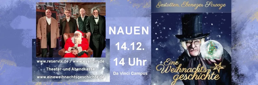 Am 14. Dezember um 14:00 Uhr lädt der Da Vinci Campus zur Bühnenfassung von A Christmas Carol von Charles Dickens ein – professionell umgesetzt vom Ensemble der Schlossfestspiele. In der Geschichte steht der geizige Ebenezer Scrooge im Mittelpunkt, dem vier Gespenster erscheinen und der den Wert von Mitmenschlichkeit, Gemeinschaft und Veränderung erkennt.